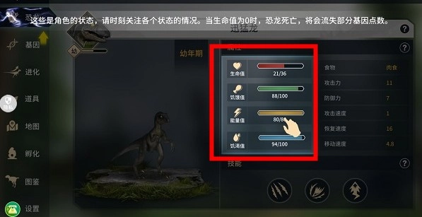 - 生命值归零恐龙死亡,同时流失部分基因点数。