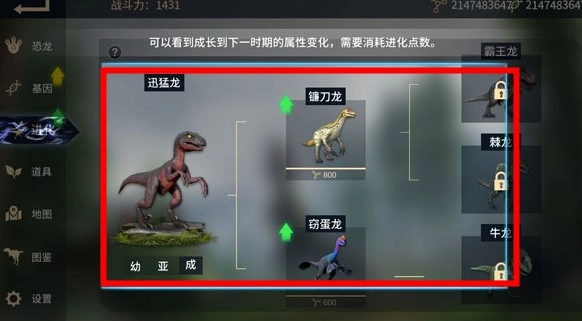 通过捕食其他恐龙或是摄取植物来获取经验值与进化值,以此提升恐龙的基因水平。