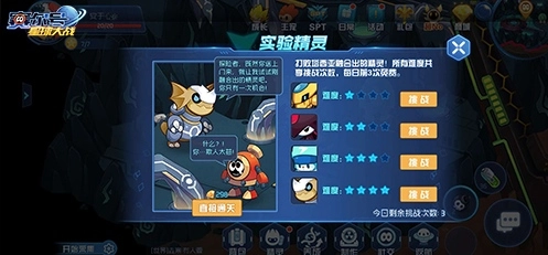 接下来是第二关“实验精灵”。这个任务相对复杂,也存在一定难度,我们要战胜塔西亚融合生成的四只宠物,而且每天仅有3次挑战机会。