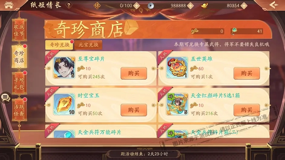活动期间,少年们可消耗元宝直接兑换指定数量的至尊宝碎片、赤金将碎片20选1箱、赤金神兽碎片6选1箱、赤金神兵碎片6选1箱、赤金军师碎片6选1箱、金色精研书碎片、紫金碎片选择箱(六)、终极命星随机箱、星宿凝晶、唤灵石、兵书残卷、高级养成资源选择箱及基础养成资源选择箱等稀有资源。