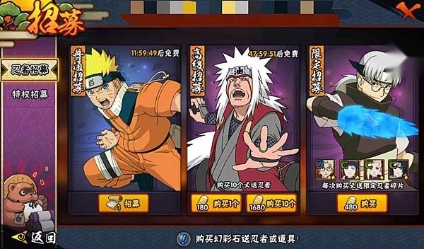 忍者招募包含普通招募、高级招募、限定招募与特权招募几种形式。其中普通招募全程免费;高级招募每48小时能免费进行1次;限定招募和特权招募则专门面向拥有V特权的玩家开放。另外,通过招募活动购买幻彩石,还会额外赠送忍者或道具奖励。普通招募获取的忍者碎片品质相对普通,且不少是已拥有忍者的碎片,这些碎片可用于后续忍者升星;高级招募一次性购买10次有折扣优惠,并且必定会赠送高级忍者,若条件允许,建议选择高级招募。