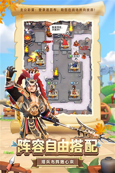 3、策略制胜,百种路线关卡无限,海量地图搭配不同武将布阵,技能合理搭配,过关斩将。