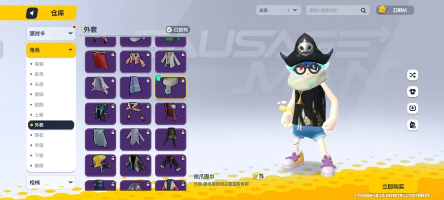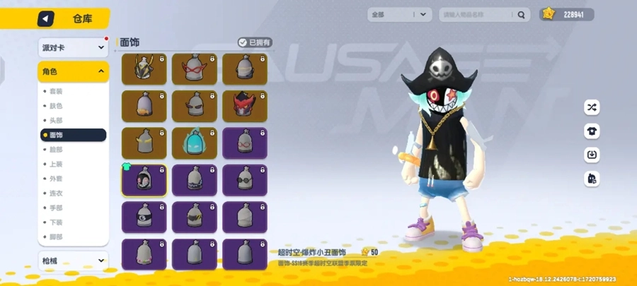玩家可以在仓库界面中,为角色配备派对卡、装扮、枪械、近战武器、气泡、动作、玩具、载具等各类道具。角色使用这些道具不会附加任何属性效果,仅具备装饰功能。