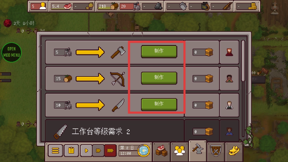 4、进入制作界面后,消耗相应资源来打造斧头、弓箭、刀这类装备,以此增强人员的战斗能力