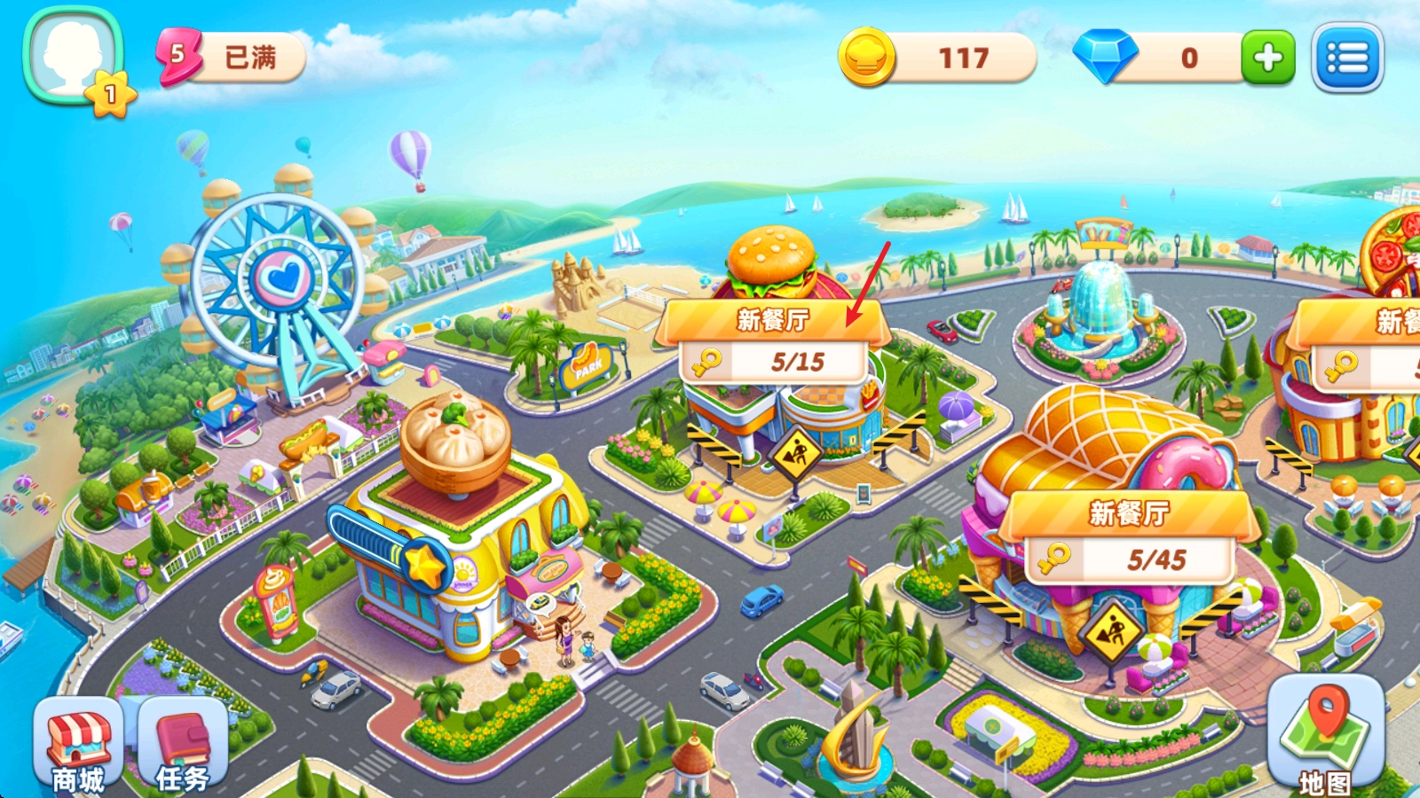 7、通过闯关收集到一定数量的钥匙后,我们就能解锁新的餐厅了。