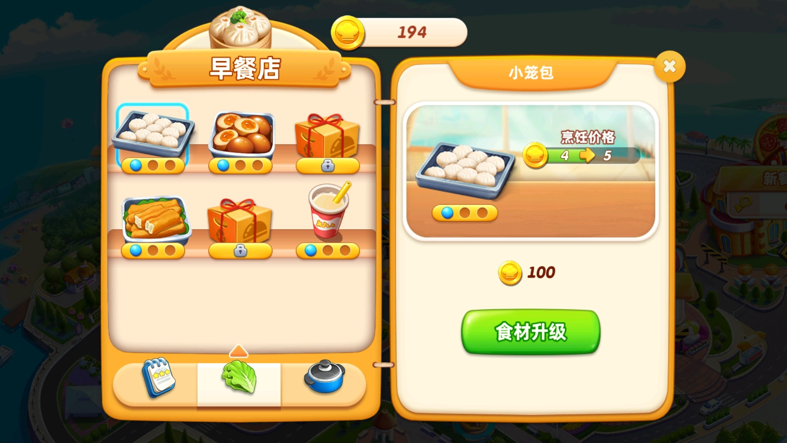 3、别忘记升级你的食材和厨具,优质食材能帮你提升收入,而高级厨具会让你在烹饪时更顺手!