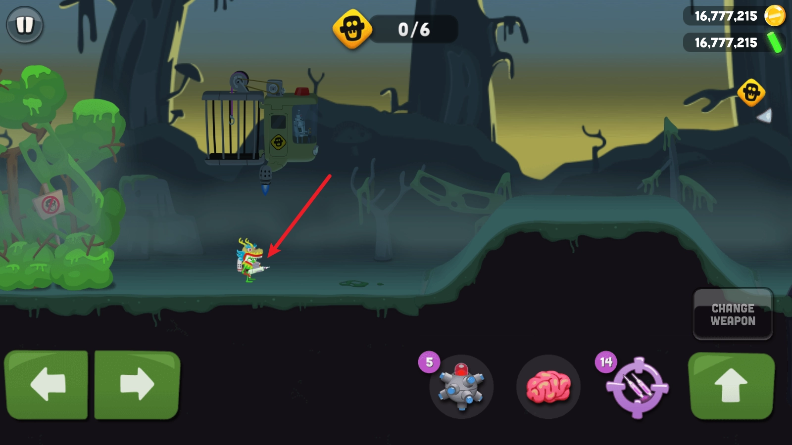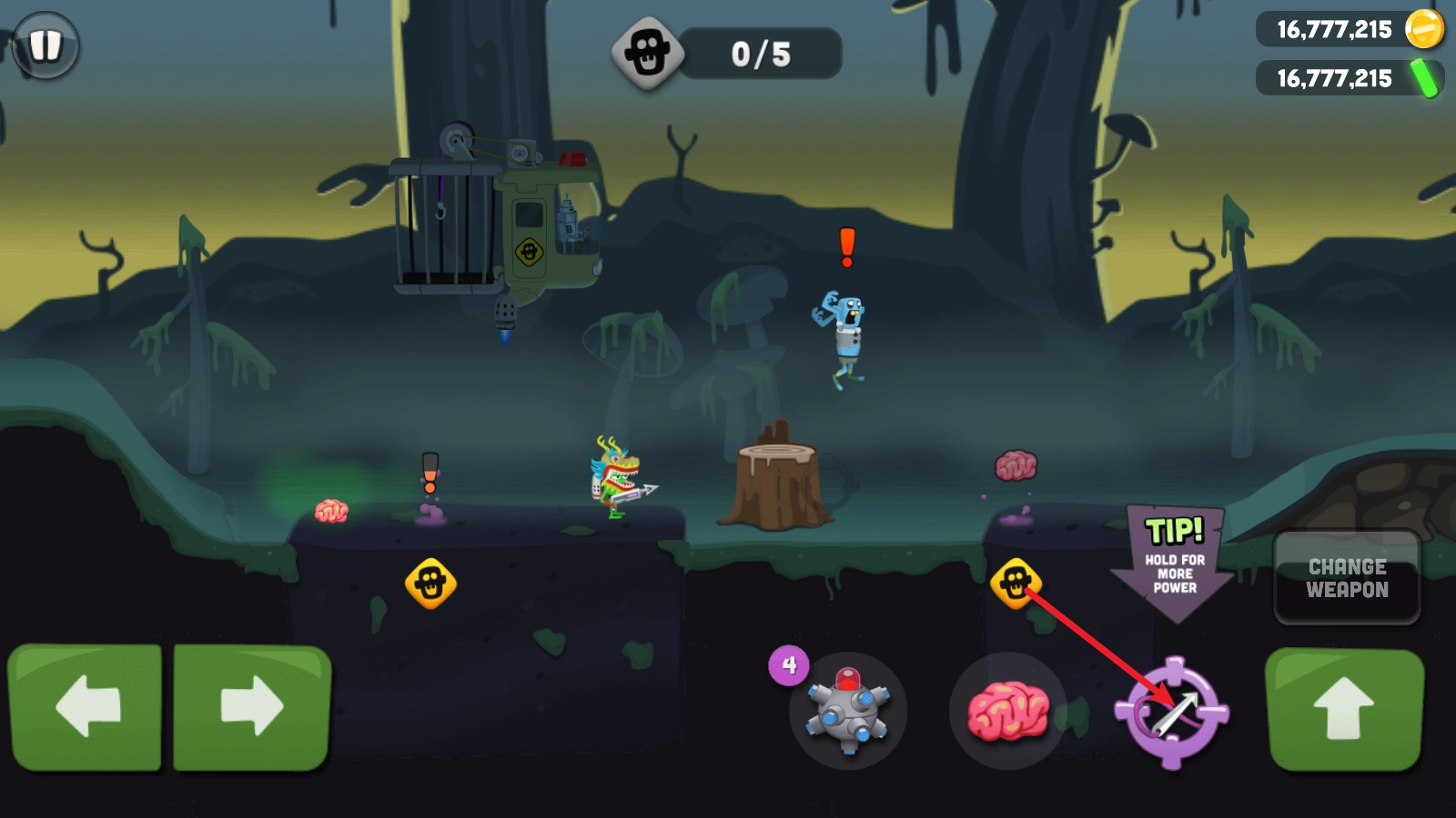2、点击右侧的黑色按钮,就能切换自己的武器,一种是用于抓捕的爪子,另一种则是带有使用次数限制的武器。