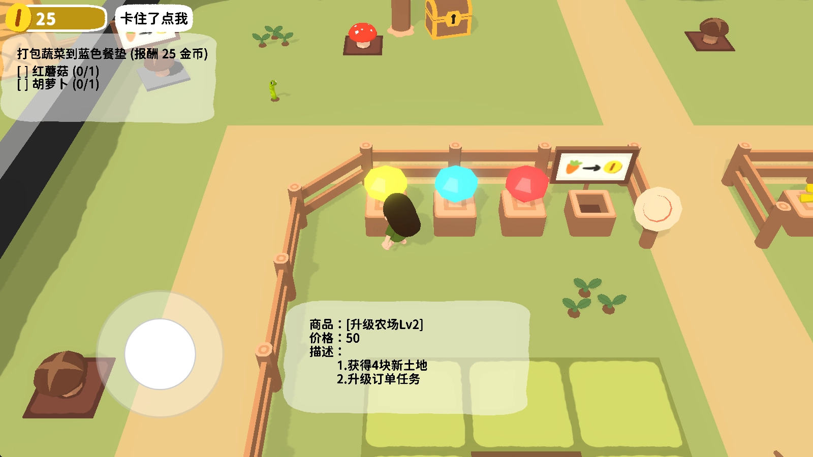 1、玩家需依据任务要求,选择合适位置种植对应作物,通过赚取足量金币来解锁更多区域。
