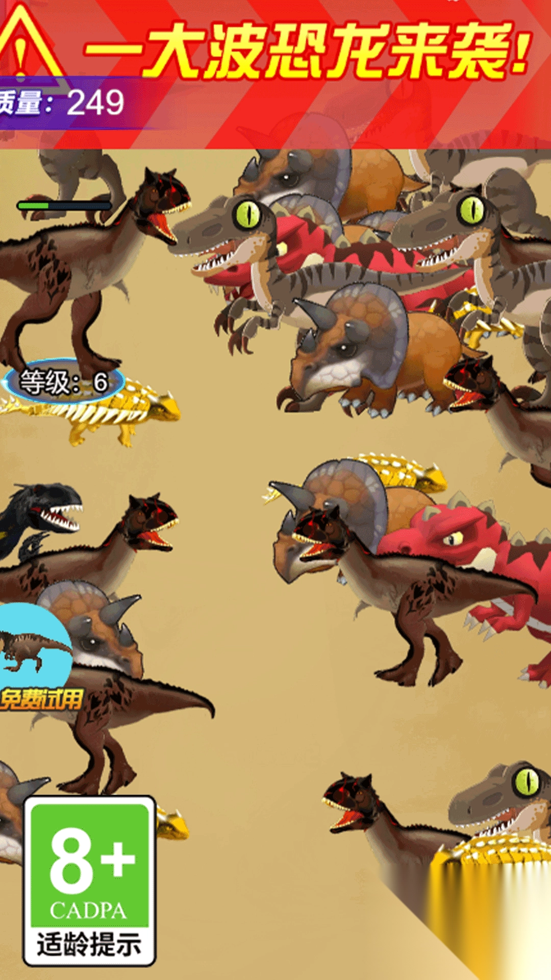 1、玩家需熟悉各类恐龙的特性,在恐龙战场上不断吞噬,当吞噬达到一定数量的恐龙后即可完成进化。