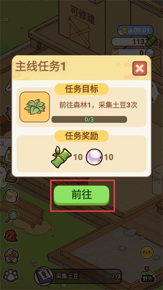 1、【主线任务1】要求前往【森林1】采集【土豆】3次,点击【前往】按钮就能进入对应场景开始采集。