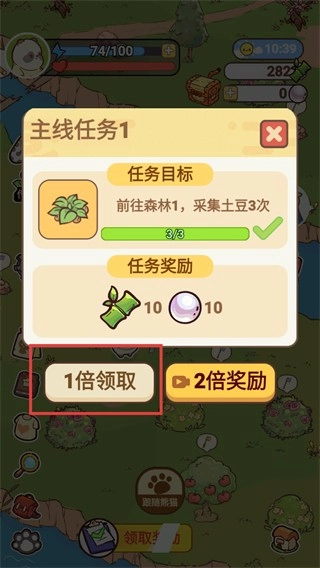 3、完成【主线任务1】的采集环节后,点击【1倍领取】按钮,就能得到【竹子×10】和【珍珠×10】的任务奖励。