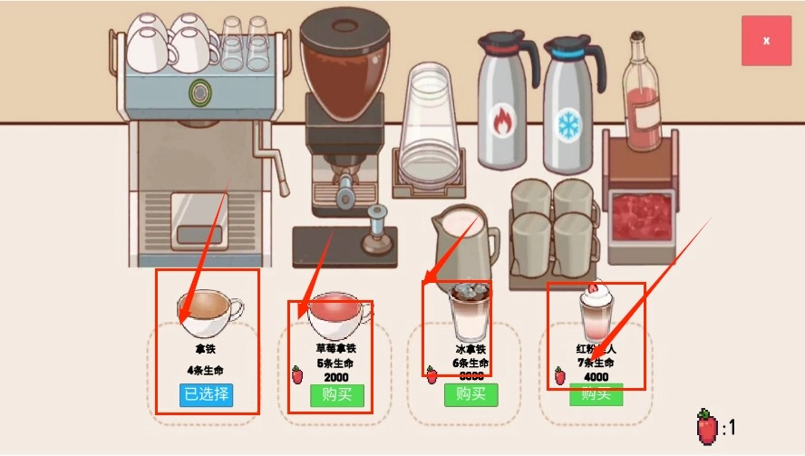 3、可以购买各种饮品增加你的生命值。