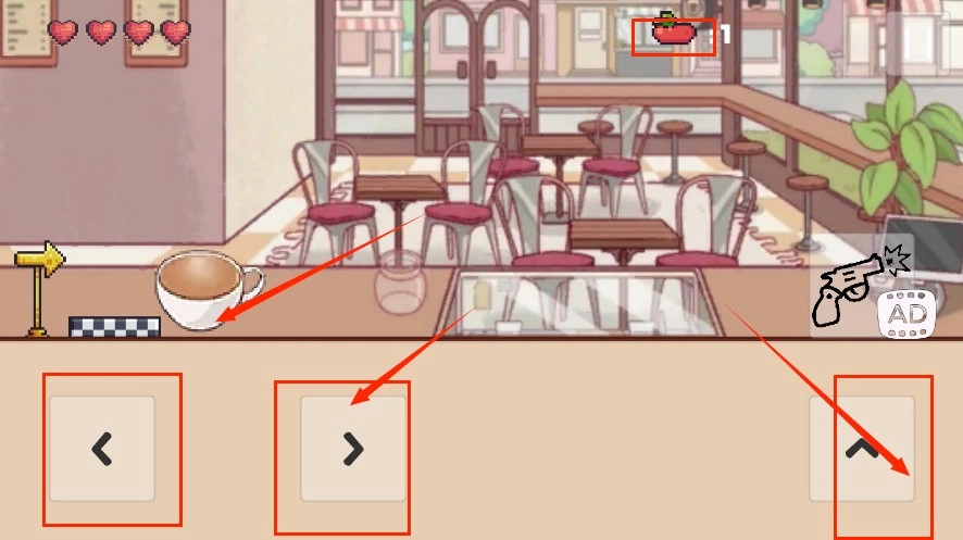2、通过操控咖啡来完成关卡挑战,途中收集草莓;左侧控制前后移动,右侧控制跳跃动作。