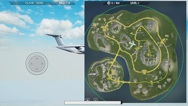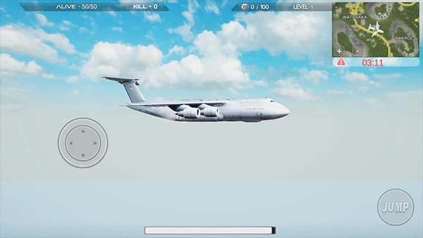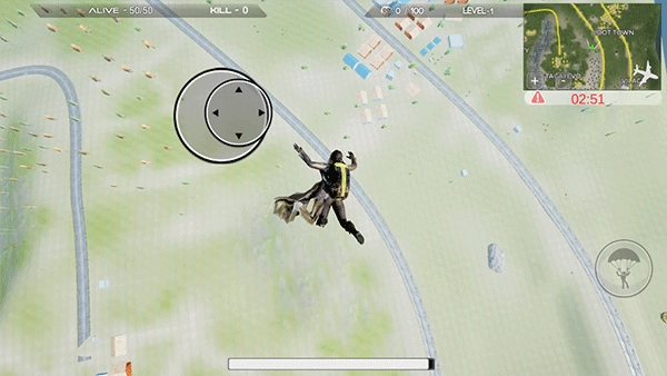 你可以借助右上角的小地图来选定初始降落的位置。跳伞过程中,向前推动虚拟摇杆能让速度提升到234km/h,这样就能更早落地,抢占开局的优势。要是把视角拉平,就能维持125km/h的速度,朝着更远的落点飞去。