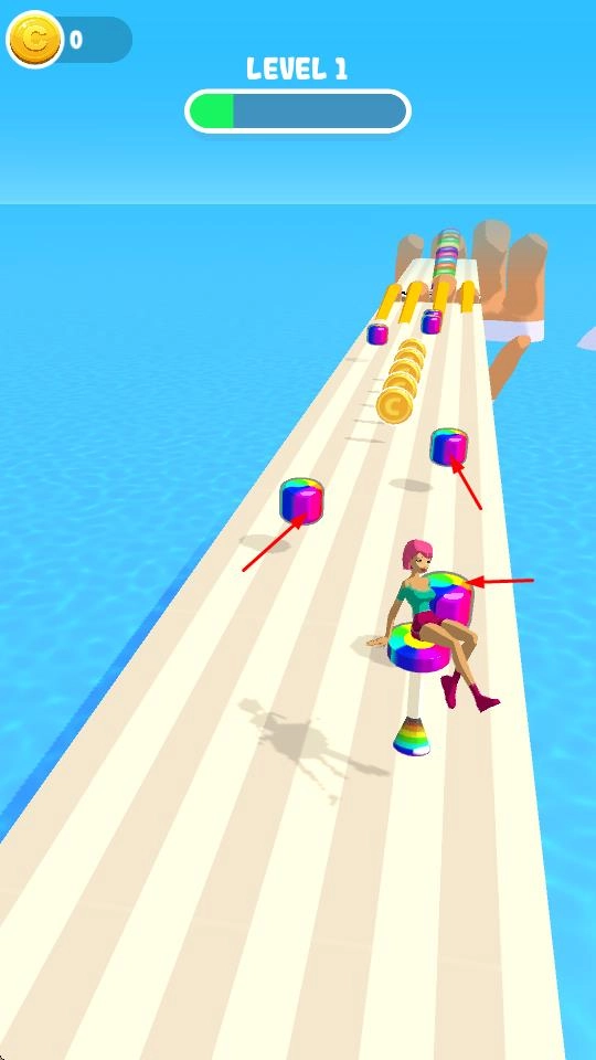 进入游戏后,你需要操控角色在赛道上移动,角色可以朝着多个方向前进,同时收集沿途的彩色圆柱等各类道具,以此来获得金币奖励。