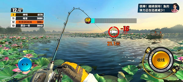 5、鱼儿上钩后我们要合理地点击收线,等鱼力气耗尽就能成功钓到了。