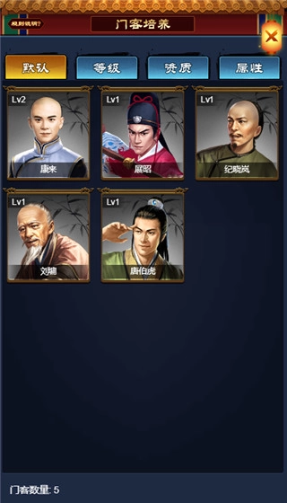 老爷们的前期门客是直接初始附送的,分别是康来,展昭,纪晓岚,刘墉还有唐伯虎。