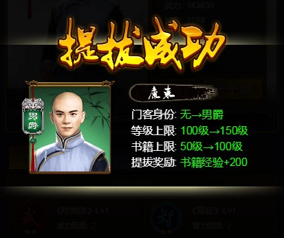 成功提拔后的门客在门客列表处会变成当前爵位的品质,且同时还会附送一定量的书籍经验,用于晋升门客的资质