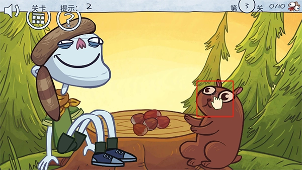 点击小松鼠,让它吃掉一颗榛子;接着点击角色,也让角色吃掉一颗榛子;最后只要让角色把剩下的两颗榛子都吃掉,就能顺利通关啦。