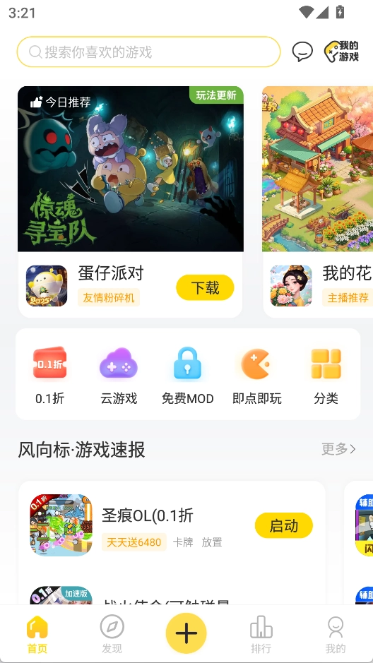 首页设有今日推荐、游戏速报等板块,点击进入就能获取当下热门游戏的最新推荐内容。