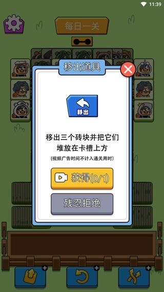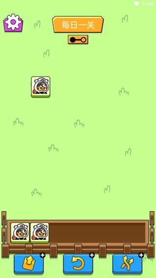 2、游戏采用三消玩法,设有两关,点击三个相同的方块移至下方七格横框内即可完成消除。