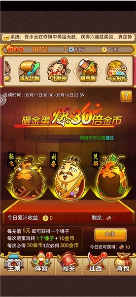 4、砸金蛋活动可以说是充值最划算的时候,如果想充点钱玩就趁着砸金蛋的时候充,建议1天充30就够了,因为没有50的选项