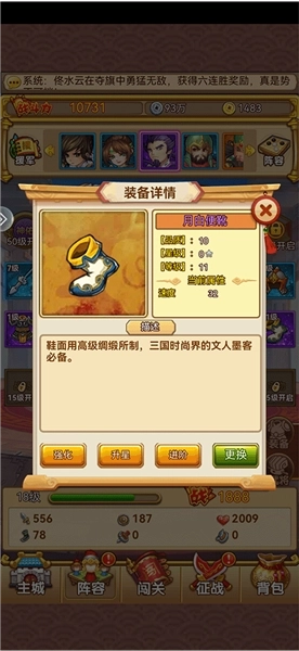 13、这个游戏装备比武将重要,装备可以快速的提升战斗力,但是记住千万别乱强化,因为这个游戏强化后的装备卖掉只返还1/10的价格非常坑,蓝装紫装无套装的建议最多强化到40-50级顶死了~早日进军团,去军团商城购买套装吧,套装建议最少要买出6套,最后2套可以加上之前的收集把金装弄上,金武器加3紫套装也永远比4件套的紫装好。