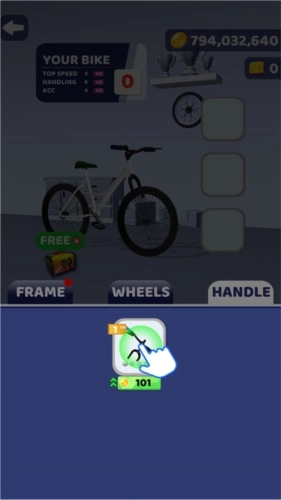 6、进入车库界面后,点击手柄就能更换新的自行车手柄,车架也可以一并更换。