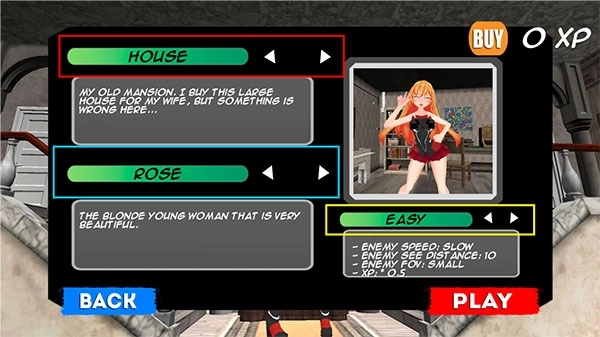 1、进入惊险的妻子游戏,界面如图所示:红框标注的“house”按钮可切换场景地图,黄框的“easy”选项能调整游戏难度,蓝框的“rose”功能可更换不同形象的妻子。完成各项设定后,点击“PLAY”即可开始游戏。