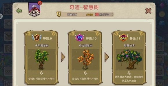 4、四级及以上的智慧树能够采集到树叶,合成七级及以上的智慧树时有几率获得雨林,目标是刷出至少一个一级雨林。