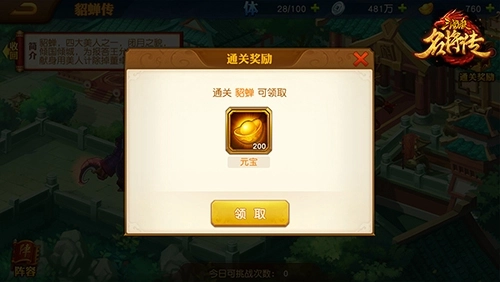4、每完成一个名将传记的通关挑战,就能领取对应的通关宝箱,里面藏着丰厚的元宝奖励呢。