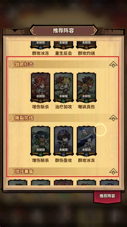 3、可以看到推荐的各种阵容,可以用更具喜好进行搭配