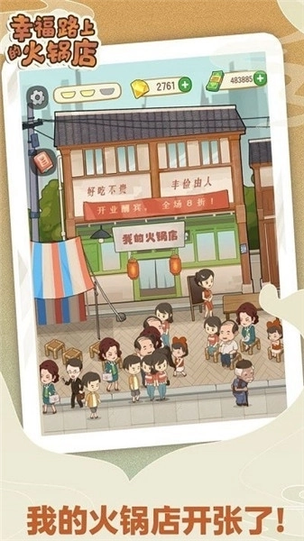 3、游戏里能截图自家小店来招揽顾客,也能参观其他火锅店的规模作为参考,画风特别萌!