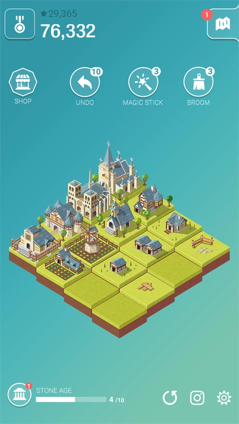 2048 合并玩法与文明演进相结合:通过滑动4×4的方格,让相同的建筑合并升级(比如茅草屋能合成木屋,木屋再升级为城堡,城堡可进阶为摩天楼),只要合成出11种不同的建筑,就能解锁下一个时代。