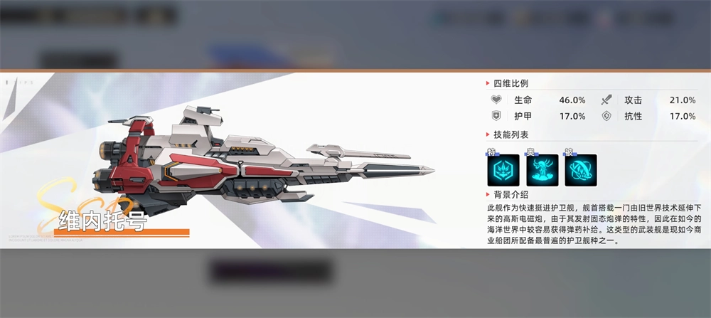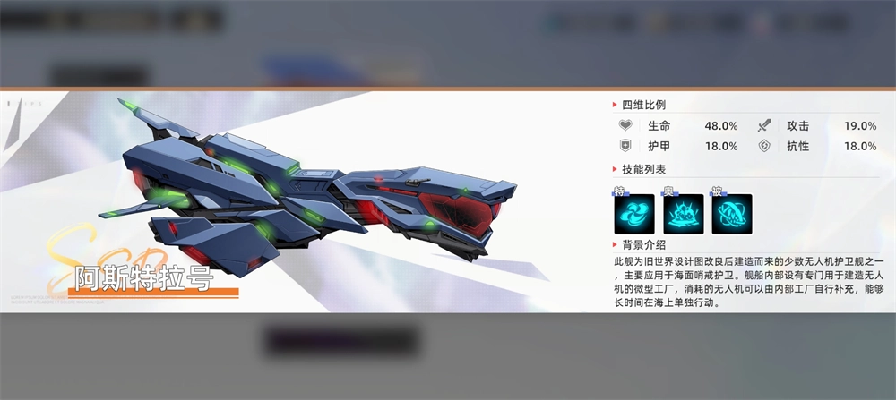 这是一艘基于旧世界设计图改良建造的少数无人机护卫舰之一,主要承担海面哨戒与护卫任务。舰上配备了专门制造无人机的微型工厂,损耗的无人机可由内部工厂自行生产补充,因此具备长时间独立在海上执行任务的能力。