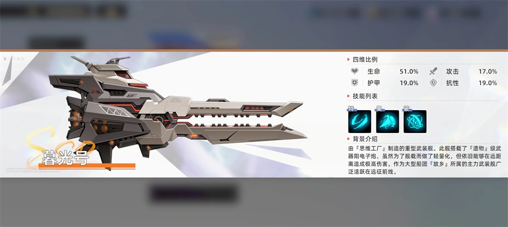 由「思维工厂」打造的重型武装舰,配备着「遗物」级的阳电子炮武器。尽管为适配舰载需求进行了轻量化处理,但其在远距离作战时仍能释放出极强的破坏力。作为大型船团「故乡」麾下的主力武装舰,它在远征前线的战场上十分活跃。