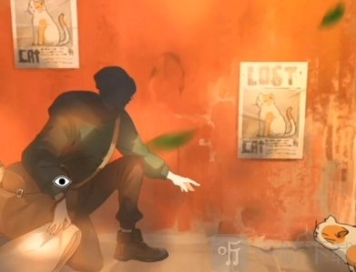 3、把视角转移到对面的老人身上,能瞧见老人正轻抚着小猫,之后完成中央的那幅画作。