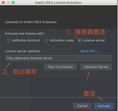 一、采用最后一种 License server 激活方式,在地址栏填入:http://jetbrains-license-server (通常会自动填写),也可点击按钮 “Discover Server” 以自动填充地址,进而完成激活。