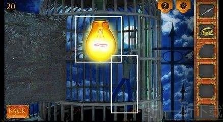 四、在画面左侧点击鸟笼,点击其中一根铁棍,会有淡黄色的光传出。接着,点击空的凹槽,将其放置到对应的位置。之后,按照图示,把最后一根也放到相应位置,门就会打开,进而可获得灯泡和钳子。