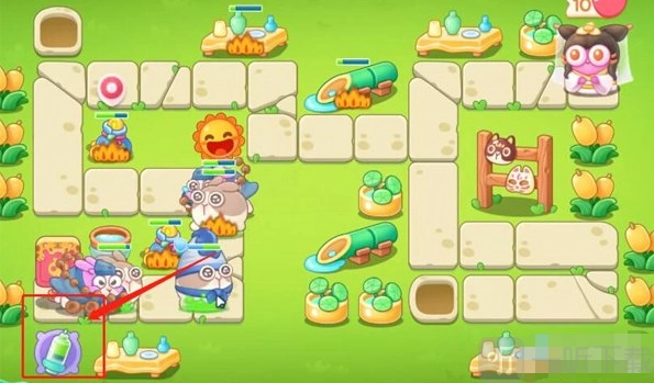 9、在第九波中,于中间位置增添一个回旋镖,同时在右侧再添加两个火瓶,具体的塔防布局如下图所示。