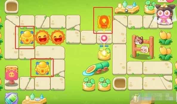 4、第四波的时候,额外增加两个元宝,同时在中间位置添加一个火瓶,用来清理下方的障碍物。