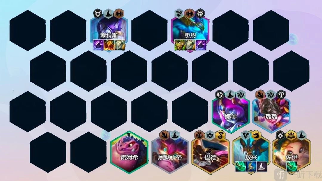 后期阵容构建:在游戏进行到5 - 2回合时,将人口提升至9。升至9人口后,务必确保我们拥有20金币以上甚至30金币以上。原因在于,2星敖兴价值30金币,如果金币不足,即便搜到敖兴,也会陷入有钱搜卡却没钱购买的尴尬境地。搜到敖兴后,可将瑞兹换下,换上敖兴,并把瑞兹的装备给予敖兴。同时,将奥恩替换为赛芬,最后补上佐伊。进入大后期,着重提升其他5费卡的星级,如此便有很大机会成功吃鸡。