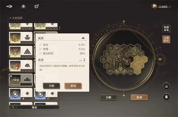 青的古痕配置建议选用“虎贲”词条,于原本的铂鸢古痕配置中增添暴击、穿透以及爆伤这三项,以此增强爆发潜力。