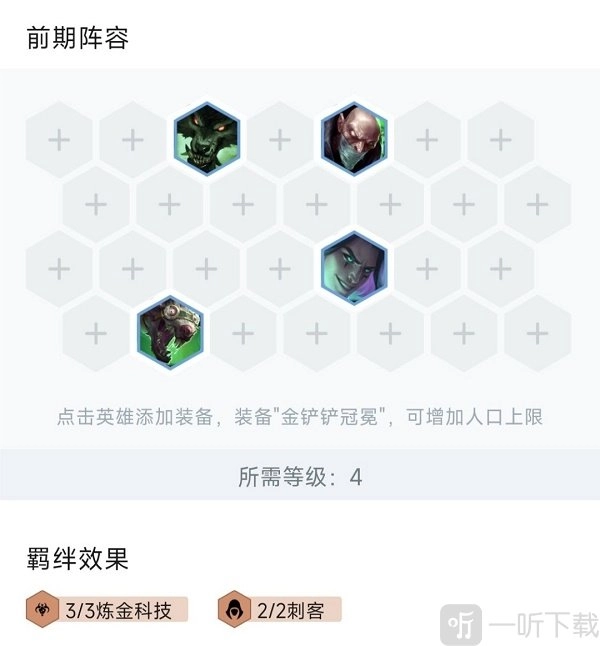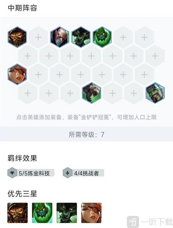6. 当处于七人口阶段时,依据经济状况搜取阵容牌以获取三星,留牌的先后顺序为:蛮王>扎克>奎因>狼人 。此时要达成五炼金科技与四挑战的阵容组合,待三星后提升至八人口就行,补上蔚或者希尔科,然后根据场上实际局势,再去考虑是否升至九人口。