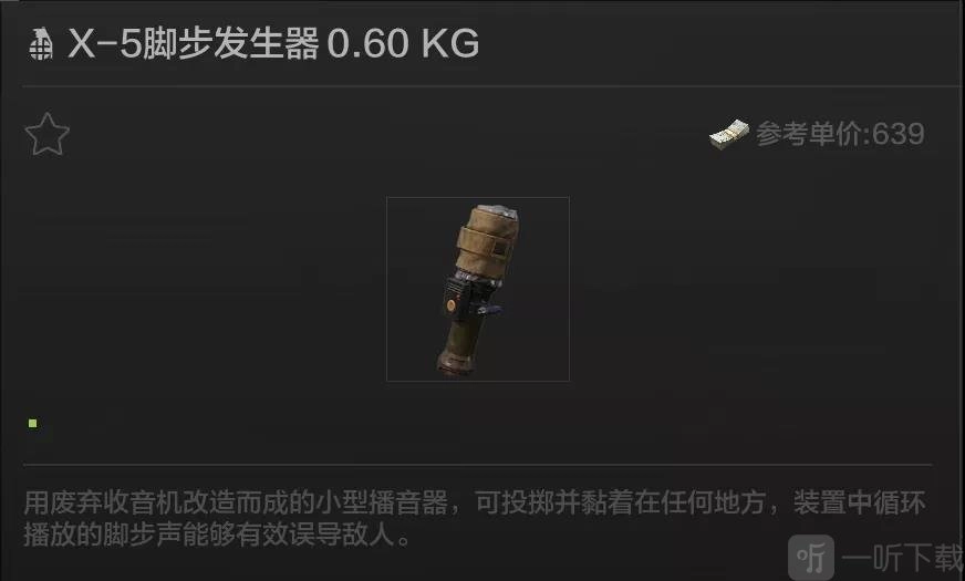 利用废弃收音机改装而成的小型播音器,具备投掷后可黏附在任意位置的特性,其装置内循环播放的脚步声能对敌人起到有效的误导作用。