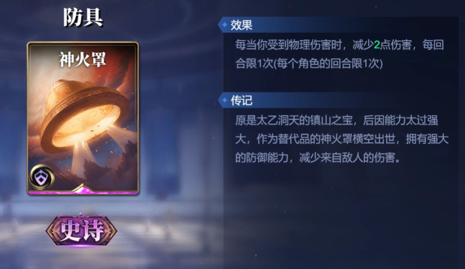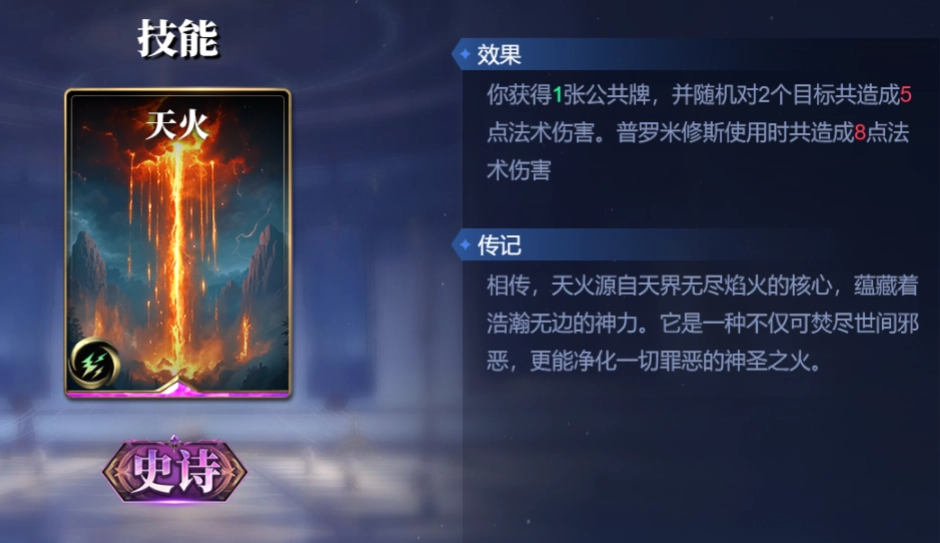 天火,使用后可获取1张公共牌,同时随机对2个目标总共造成5点法术伤害。若由普罗米修斯使用,则总共造成8点法术伤害。