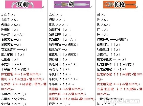 《流星蝴蝶剑.net》里包含十多种武器,每一种武器都具备一套完备的招式系统,每一个招式都得通过特定的指令组合才能够施展出来。举例来说,剑的“流星赶月”招式对应的指令是“↓→↑A”,而枪的“回马枪”招式所对应的指令则是“→↓←A”。