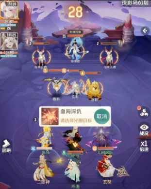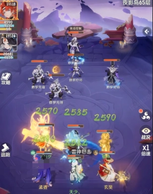 在进入到夜银岛65层时,修罗会分波次的出现前排很厚,后排拥有高伤害,因此就会集火玄奘。玄奘需要用技能直接打断对方的嘲讽。在第2波修罗刷出来之后,就可以让辅助给玄奘加上免控还有减伤,优先秒杀后排的修罗咒师,此时金色的灵兽就会粘住残血,可以迅速的补充伤害。在进入到残血阶段时,也并不需要过于的担心,玄奘可以找一个机会,收掉最后一波。