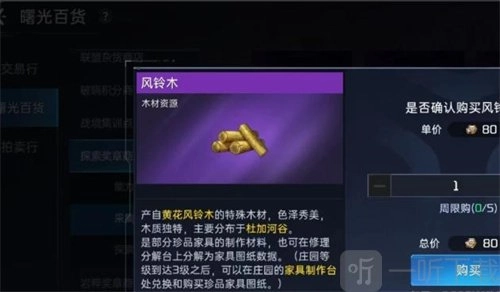 如果一些玩家运气不好或者实在赶时间,想要得到风铃木的话,那么你可以前往探索奖章商店中去获得,但是也不是免费就能够得到的,我们需要拥有很多的探索奖章才可以去兑换。一般来说想要是做家具都需要一些紫色级别的上等资源,怎样获得他们也可以和游戏里的其他玩家进行交易。因为很多玩家都需要金条来提升自己的战力,这时我们就可以用金条去兑换他们的风铃木。