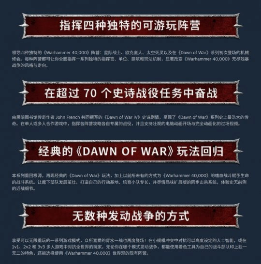 《战锤40K:战争黎明4》设有星际战士、兽人、死灵族与机械教四个可操控阵营,提供多段非线性战役,支持1v1、2v2、3v3的多人竞技玩法,同时“背水一战”“遭遇战”等经典模式也将回归。该作计划于明年在PC平台推出,目前KING Art Games暂未对外公布官方的系统配置需求。